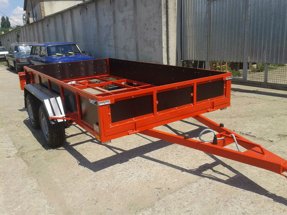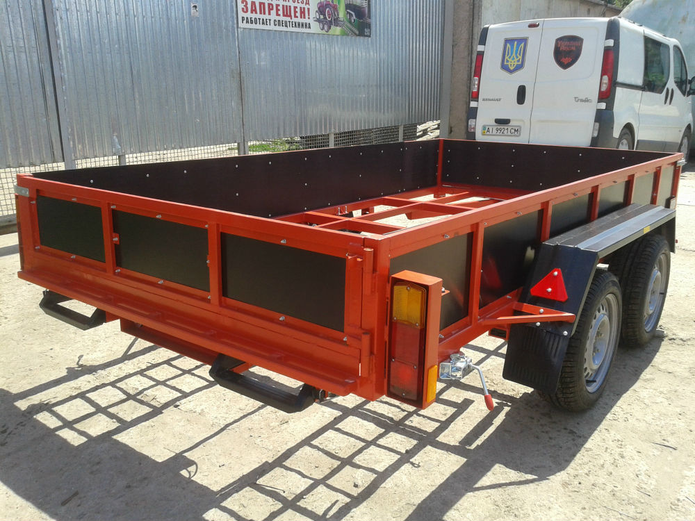 Прицеп бортовой универсальный, можно использовать как просто бортовой, и как лафет для перевозки спецтехники. Грузоподъёмность 1,5т. Передний борт открывается, что позволяет возить грузы на 0,5м длиннее. Пол прицепа застеляем по желанию клиента - фанера бакелит, дерево, метал (в доплату). Рессора АЛКО, светотехника Польша.